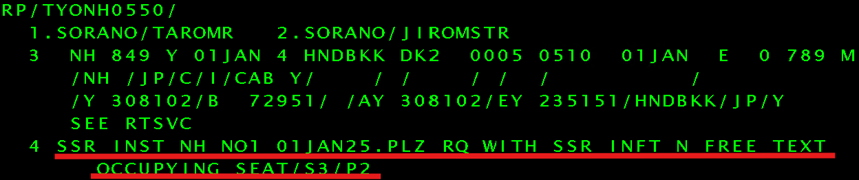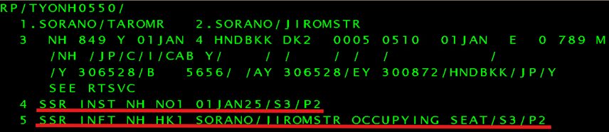 1) If the conventional format for an infant occupying a seat is inputted, SSR INST will be automatically added. The SSR INST entered for an NH flight will turn to "NO" status.